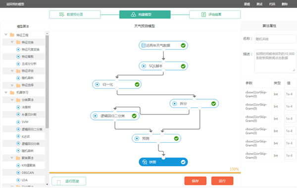 用戶全程無需編寫代碼即可完成機器學習計算任務。友好的WEB交互式界面,用戶可選擇算法,搭建包含數據預處理、特征工程及機器學習算法的工作模型,填寫算法參數并選擇計算資源,即可完成所設定的工作流程,由服務器計算任務結果并展示結果。