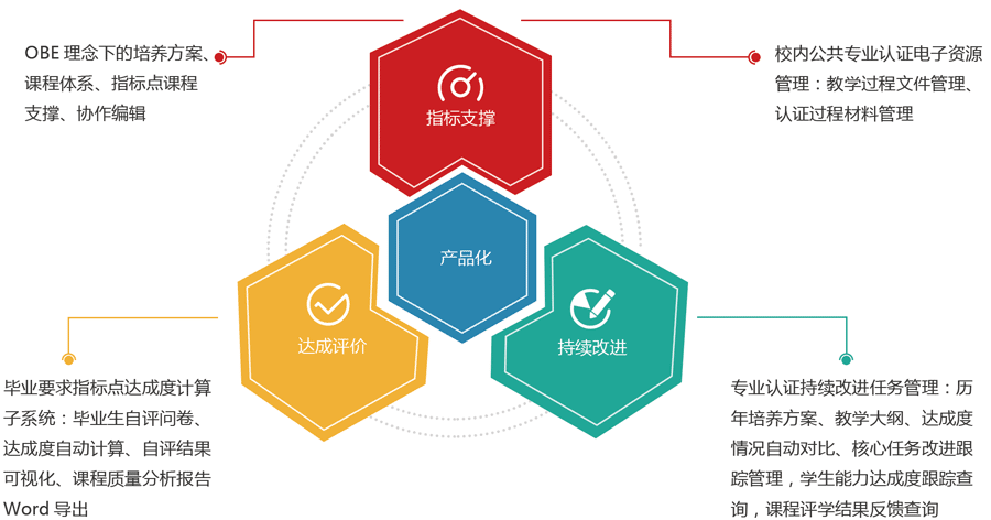 以高效通過工程教育認證為中心,以解決復雜教育工程問題為重點,以學生能力培養為目標,系統設計培養方案,并站在人才培養系統的高度重新確定課程教學目標和教學內容,以研究型教學引導學生建立探索和分析的意識,學習探索和分析的方法,形成探索和分析的基本能力,建立完整的持續改進機制,通過面向產出的內部質量監控、畢業生跟蹤反饋和社會評價三大機制的建立和運行,不斷提高人才培養質量和水平。以更好的協助高校進行工程教育認證工作,減輕領導、老師在梳理、計算、自評、佐證等工作的負擔。